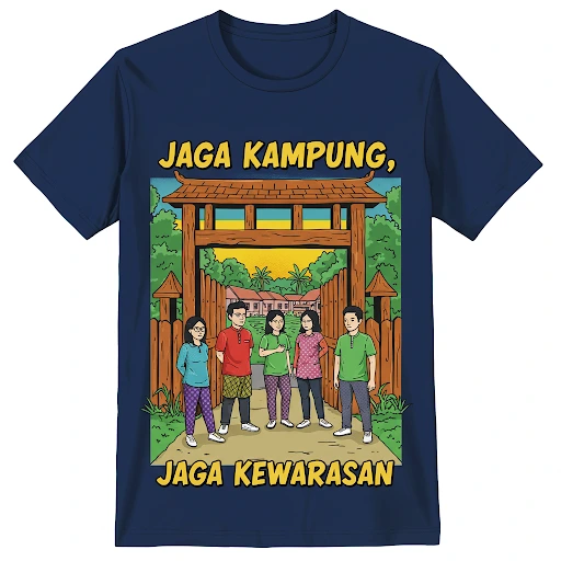- Kaos bertema “Jaga Kampung, Jaga Kewarasan” dengan ilustrasi anak muda lagi jagain portal.